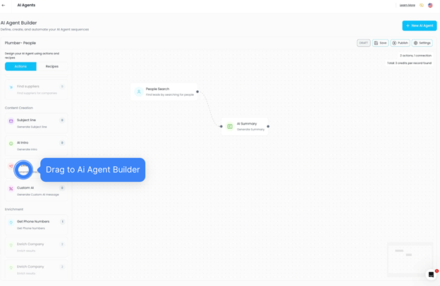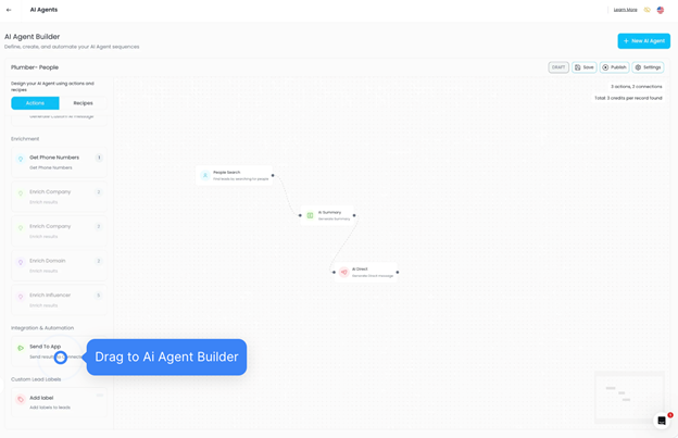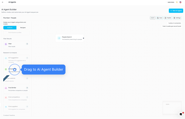 Learn how to build and publish your first AI Agent in the Lead Generation Tool. Automate tasks like generating summaries, sending direct messages, and syncing leads to your CRM for faster, efficient prospecting.